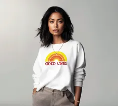 good vibes art, rosa Regenbogen-Design, Retro-Ästhetik, fröhliche Grafik, aufbauende Botschaft, farbenfroher minimalistischer Stil