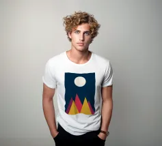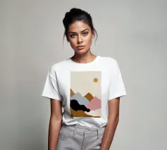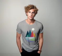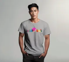 Geometrische Formen bilden eine minimalistische Berglandschaft mit einem Kreis darüber, der an die Sonne erinnert. Unten ist eine umgekehrte Spiegelung der Gipfel abgebildet, wodurch ein symmetrisches Design entsteht.