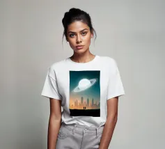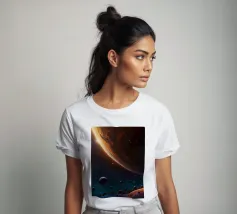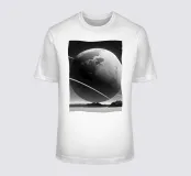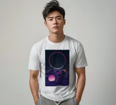 Ein großer, mit Ringen geschmückter Planet schwebt über einer kargen Landschaft, während entfernte Himmelskörper den Sternenhimmel erhellen. Die Schatten der Berge verleihen der surrealen Szenerie zusätzliche Tiefe.