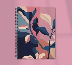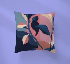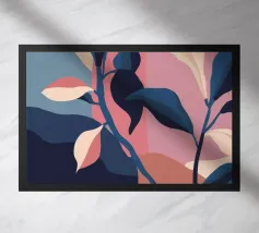 Abstrakte botanische Formen, darunter Blätter und Stängel in Rosa-, Lila-, Blau- und Beigetönen, sind vor einem dunklen Hintergrund angeordnet. Die Komposition ist elegant und modern und konzentriert sich auf organische Formen und das Zusammenspiel der Farben.