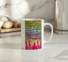 Ein Flickenteppich aus verschiedenen Mustern, darunter Linien und U-Formen, in leuchtenden Gelb-, Blau-, Rosa- und Rottönen, erzeugt in diesem abstrakten Stück einen farbenfrohen Mosaikeffekt.