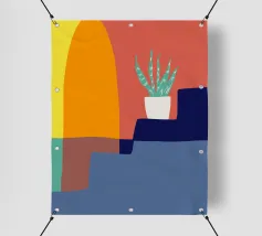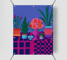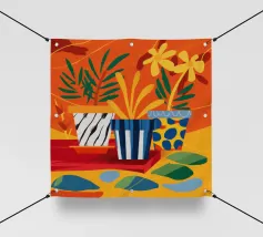 Eine abstrakte Illustration zeigt eine farbenfrohe Treppe, die mit einer Vielzahl von Topfpflanzen geschmückt ist und Architektur und Botanik in einer lebendigen, modernen Komposition vereint.
