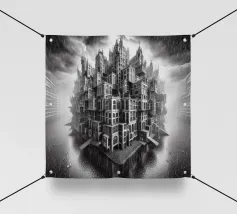 Dieses Bild zeigt eine komplizierte kreisförmige Architektur mit verschnörkelten Steinsäulen, einer zentralen Statue und einer Glasdecke. Die surreale Perspektive erzeugt einen tunnelförmigen Effekt, der das Auge auf das Zentrum der Komposition lenkt.