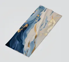 Dieser elegante, abstrakte Hintergrund zeigt fließende Gold- und Silberelemente mit kreisförmigen Akzenten auf einer sattblauen Leinwand und sorgt so für eine beeindruckende visuelle Wirkung, die sich für kreative Projekte eignet.