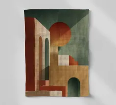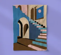 Ein abstrakter architektonischer Raum wird durch eine strenge Treppe und sich überlappende Bögen definiert, wobei ein dramatisches Spiel von Licht und Schatten eine kraftvolle, minimalistische Komposition schafft.
