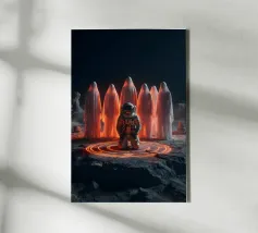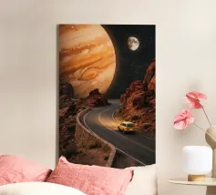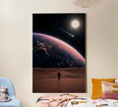 Erleben Sie die Magie des Reisens und des Nachthimmels mit diesem stimmungsvollen Kunstwerk, das eine Hand zeigt, die sanft ein Flugzeugfenster mit Blick auf leuchtende Wüstendünen berührt. Eine Mondsichel leuchtet vor einem tiefblauen Himmel voller Sterne und schafft eine heitere Mischung aus Fernweh und Staunen. Der warme, goldene Sand steht in schönem Kontrast zu den kühlen Nachttönen und fängt das Gefühl von Einsamkeit, Reflexion und Träumen über der Welt ein. Perfekt für Reiseliebhaber, Minimalisten und Fans von filmischen, verträumten Fensterbildern.