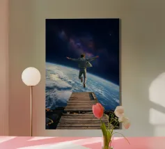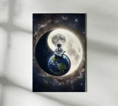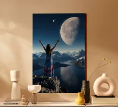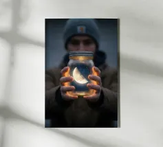 Erleben Sie die Magie des Reisens und des Nachthimmels mit diesem stimmungsvollen Kunstwerk, das eine Hand zeigt, die sanft ein Flugzeugfenster mit Blick auf leuchtende Wüstendünen berührt. Eine Mondsichel leuchtet vor einem tiefblauen Himmel voller Sterne und schafft eine heitere Mischung aus Fernweh und Staunen. Der warme, goldene Sand steht in schönem Kontrast zu den kühlen Nachttönen und fängt das Gefühl von Einsamkeit, Reflexion und Träumen über der Welt ein. Perfekt für Reiseliebhaber, Minimalisten und Fans von filmischen, verträumten Fensterbildern.