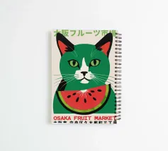 cat watermelon fruit green eyes ears nose whiskers text letters japanese writing block letters english text market food red green black white facial expression slices