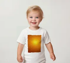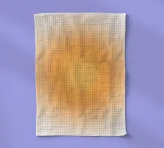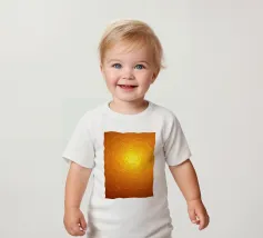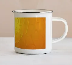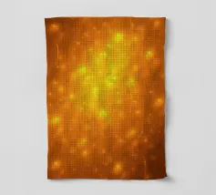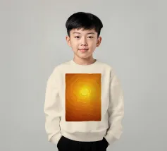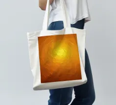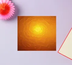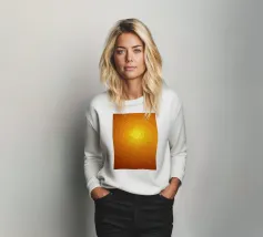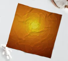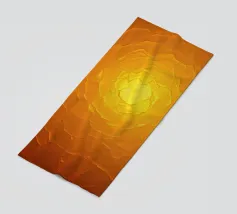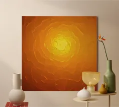 Warme Orange- und Gelbtöne vermischen sich zu einem abstrakten, mehrschichtigen Muster, das an das Sonnenlicht erinnert. Das Design weist komplizierte Texturen auf, die den Blick nach innen lenken.