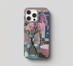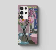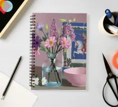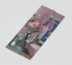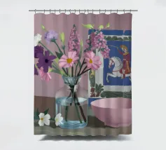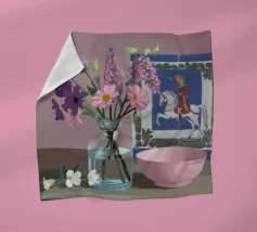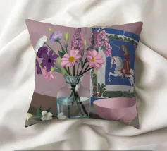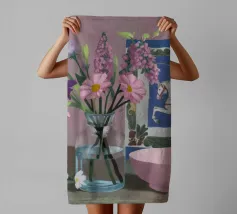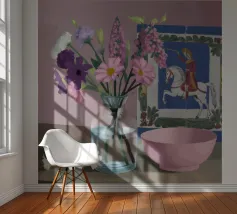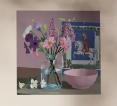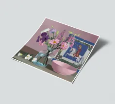 Ein realistisches und zartes Stillleben mit einem Strauß violetter Schwertlilien in einer Klarglasvase und zwei kleinen Vogelfiguren in der Nähe. Die Komposition ist klassisch, elegant und schön beleuchtet.