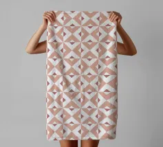 Ein sich wiederholendes Muster mit roten und weißen geometrischen Formen auf einem zartrosa Hintergrund. Jede Form ähnelt einem Halbkreis, der auf einem Trapez gestapelt ist, wodurch ein kohärentes und rhythmisches Design entsteht.
