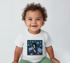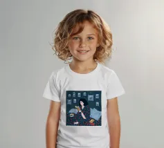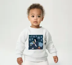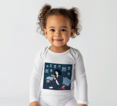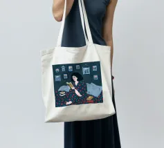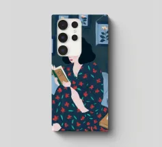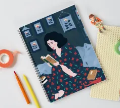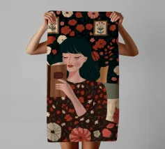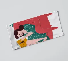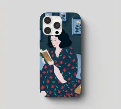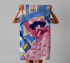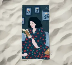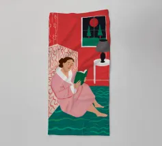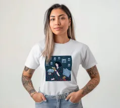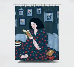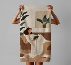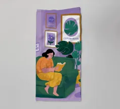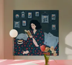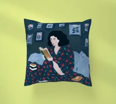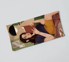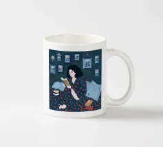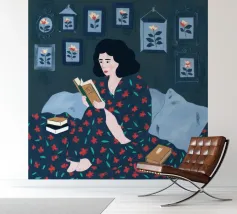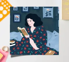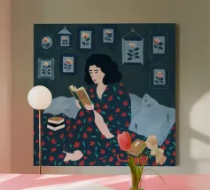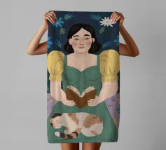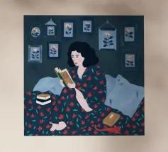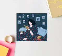 Eine Illustration einer Frau, die im Bett ein Buch liest, während eine Katze friedlich neben ihr schläft. Die Szene ist eine herzerwärmende, kuschelige und heitere Darstellung der perfekten, ruhigen Kameradschaft.