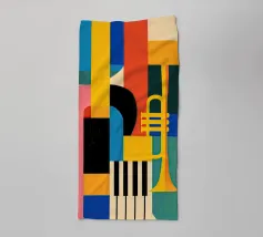 A modern abstract painting featuring geometric shapes forming guitars, violins, and musical notes in a bold, colorful composition. The textured background and dynamic arrangement evoke a sense of rhythm and artistic expression.