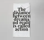 "Die Worte 'The distance between dreams and reality is called action' (Der Abstand zwischen Träumen und Realität heißt Aktion) sind in einem visuell auffälligen Typografie-Layout angeordnet und betonen die Kraft des Handelns, um Ziele zu erreichen. Der Text ist fett und eindrucksvoll und steht vor einem sauberen, minimalistischen Hintergrund, der ein Gefühl von Motivation und Entschlossenheit vermittelt",