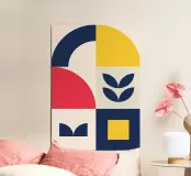 Ein ausgewogenes und ansprechendes abstraktes Poster mit einer gitterartigen Komposition aus geometrischen und organischen Formen. Das Design verwendet eine auffällige, kuratierte Farbpalette aus tiefem Marineblau, leuchtendem Gelb und kräftigem Rot vor einem hellen, cremefarbenen Hintergrund. Zu den Elementen gehören große Halbkreise, ein marineblaues Quadrat, das ein gelbes Quadrat enthält, und stilisierte, blattähnliche organische Formen, die an ein vereinfachtes botanisches oder natürliches Motiv innerhalb des modernistischen Rahmens erinnern. Dieses Kunstwerk verbindet meisterhaft geometrische Abstraktion mit einer spielerischen Ästhetik, die für den Stil der Jahrhundertmitte und des Bauhauses typisch ist. Dieser hochauflösende digitale Download (7000
