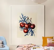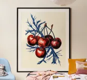 Dieses lebhafte Aquarell zeigt eine üppige Traube reifer, rubinroter Kirschen, deren glänzende Oberflächen das Licht mit einem weichen Schimmer reflektieren. Die satten, warmen Töne der Früchte stehen vor einem dramatischen Hintergrund aus tief indigoblauen Zweigen mit einer stilisierten, fast stacheligen Textur. Dieser kühne Kontrast von Farbe und Form schafft ein modernes und auffälliges Werk, das die klassische Schönheit botanischer Kunst mit einem zeitgenössischen Touch verbindet. Perfekt, um in der Küche, im Esszimmer oder in jedem anderen Raum, der einen frischen, künstlerischen Touch braucht, einen Farbakzent zu setzen.