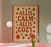 Schaffen Sie eine gemütliche und einladende Atmosphäre mit dieser charmanten Retro-Weihnachtsgrafik. Das Design zeigt die gemütliche, tröstliche Phrase "ALL IS CALM ALL IS COZY" in fetter Typografie im Vintage-Stil, umgeben von skurrilen, stilisierten Sternen und Explosionen. In einer einfachen, aber wirkungsvollen Farbpalette aus Terrakotta-Rot und Cremeweiß mit einer schönen körnigen Textur gehalten, fängt dieses Stück den nostalgischen Urlaubs-Charme der Cottagecore-Ästhetik perfekt ein. Ideal für Urlaubsschilder, Decken oder warme Kleidung. Ihr hochwertiges digitales Kunstwerk wird mit einer außergewöhnlichen Auflösung von 7000x5000 Pixeln bei 300 dpi geliefert, was gewährleistet, dass