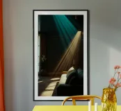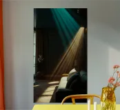 Präsentation von warmen Lichtstrahlen in einem gemütlichen Wohnzimmer Poster