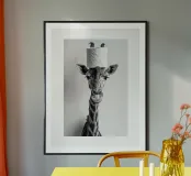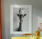 Lustige Badezimmer-Giraffe mit einer Klopapierrolle auf dem Kopf Poster