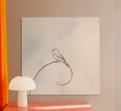 Vogel auf einer zarten Linie inmitten eines hellen Hintergrunds sitzend Poster mit Holzrahmen
