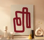 Ein geometrisches Muster mit einer durchgehenden roten Schleife auf hellem Hintergrund. Das minimalistische Design betont klare Linien und kühne Formen.