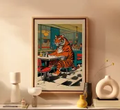 Tiger Diner – Retro Pop Art Poster mit Tiger im Café Ein Tiger sitzt gelassen in einem amerikanischen Diner – stark, surreal und charmant zugleich. Das Motiv spielt mit Kontrasten zwischen Wildnis und Alltag, Retro und Moderne. Die satten Farben, das 60s-Flair und der subtile Humor machen „Tiger Diner“ zu einem echten Statement Piece. Perfekt für Designliebhaber, die Kunst mit Charakter und Augenzwinkern schätzen.