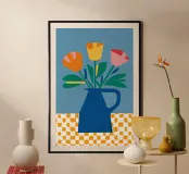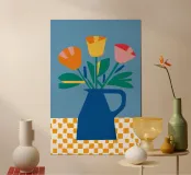 Ein Tulpenstrauß in einer kräftigen blauen Vase steht auf einer orange-weiß karierten Fläche vor einem grün-beigen Farbblockhintergrund.