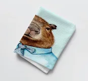 Eine charmante und raffinierte Illustration eines Wasserschweins in einem knackig blauen Hemd und einer gemusterten Fliege.