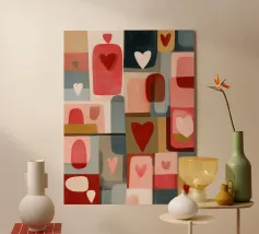 A cheerful and heartwarming patchwork of stylized plants, vibrant patterns, and a large, loving heart. This eclectic artwork is a joyful celebration of love, growth, and handcrafted beauty.