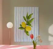 Ein raffiniertes und sehr lebendiges Poster mit einer detaillierten Aquarellillustration eines frischen Zitronenzweigs mit zwei leuchtend gelben Zitronen und sattgrünem Laub. Das botanische Kernstück steht vor einem dynamischen, maximalistischen Hintergrund aus sattem French Blue und weißen vertikalen Streifen, die alle mit einer weichen, strukturierten, malerischen Oberfläche versehen sind. Die kühne Farbkombination aus Blau und leuchtendem Gelb erzeugt einen auffallenden, fröhlichen Effekt. Dieses hochwertige Digitalposter (7000x5000 Pixel, 300 dpi) gewährleistet die satten, gemischten Farben der Aquarellfrüchte und die lebendige Textur der gestreiften