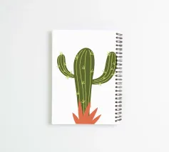 A stylized cactus with three arms and spiky details stands tall. At the base, an orange plant adds a contrasting pop of color.