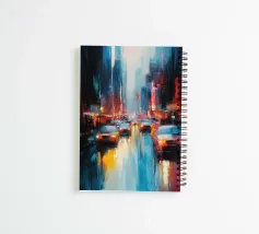 A stunning abstract painting of a vibrant cityscape at night features glowing car headlights and colorful reflections on wet streets. The dynamic brushstrokes and rich hues capture the energy of urban life.