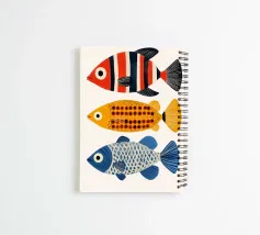 Das Bild zeigt drei stilisierte Fische, die in einer übereinander angeordneten Formation schwimmen. Jeder Fisch hat ein einzigartiges und auffälliges Design: Der obere Fisch weist rote, weiße und schwarze Streifen auf, der mittlere Fisch leuchtet in Gelb und ist mit symmetrischen schwarzen Punkten versehen, während der untere Fisch ein blaues Farbschema mit einem weißen, netzartigen Muster trägt. Die Farbkombinationen und Muster wirken künstlerisch und dekorativ, fast wie eine Mischung aus modernem Design und maritimer Ästhetik. Ein echtes Highlight für Liebhaber stilisierter Naturmotive! 🎨🐠