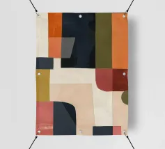 A rich, contemporary abstract composition built from layered geometric forms and deep, atmospheric colour. Curves and blocks intersect in a carefully balanced arrangement, creating a sense of architectural rhythm and visual depth. The surface texture adds a subtle, painterly warmth, softening the geometry and giving the work a tactile, crafted presence.