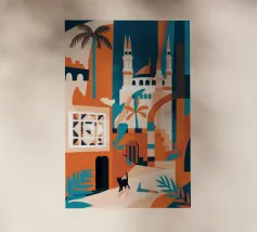 Eine moderne abstrakte Komposition aus verschiedenen stilisierten botanischen Formen und Blättern in einer Palette von Terrakotta, Beige und Dunkelblau vor einem hellen Hintergrund.
