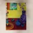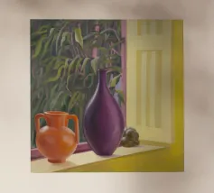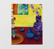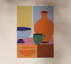 A vibrant still life displays a collection of colorful vases (purple, blue, striped), bowls, and decorative objects artfully arranged on a bright yellow tabletop against a pink and green segmented wall.