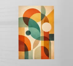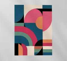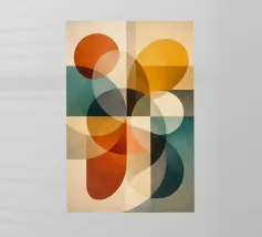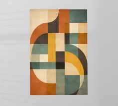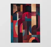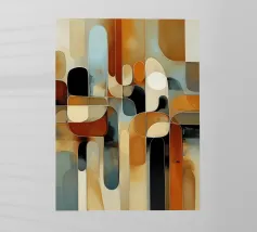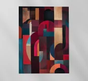 A rich, contemporary abstract composition built from layered geometric forms and deep, atmospheric colour. Curves and blocks intersect in a carefully balanced arrangement, creating a sense of architectural rhythm and visual depth. The surface texture adds a subtle, painterly warmth, softening the geometry and giving the work a tactile, crafted presence.