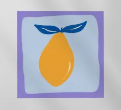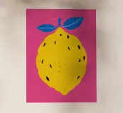 Eine große, einzelne gelbe Zitrone, illustriert mit einem strukturierten, düsteren Stil vor einem leuchtend rosa Hintergrund. Das Werk ist eine kühne, moderne und grafische Pop-Art-Interpretation einer klassischen Frucht.