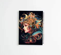 Ein exquisites Fantasy-Porträt, das königliche Eleganz mit kosmischer Symbolik verbindet. Celestial Sovereign stellt eine mächtige weibliche Figur dar, die eine kunstvolle goldene Kopfbedeckung trägt, die mit Mond- und Himmelsmotiven durchsetzt ist. Fließende Bänder in Türkis, Gold und Karminrot umschlingen sie und schaffen eine strahlende Aura von Mystik und Stärke. Ein Fest der göttlichen Weiblichkeit, des Jugendstils und der komplizierten digitalen Handwerkskunst.