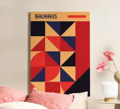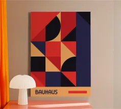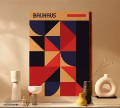 Ein lebendiges und komplexes Bauhaus-Plakat, das ein dichtes geometrisches Mosaik zeigt. Das Design besteht aus ineinandergreifenden Quadraten, Dreiecken und Viertelkreisen, die ein dynamisches, fast dreidimensionales Muster ergeben. Die kräftige Farbpalette umfasst Primärrot, tiefes Marineblau und warmes Pfirsich/Orange. Auf der Oberseite befindet sich der Text 'BAUHAUS' und ein roter horizontaler Balken, der ein klares modernistisches Layout schafft. Diese hochwertige digitale Posterdatei (7000x5000 Pixel, 300 dpi) bietet tadellose Schärfe und satte Farbsättigung für einen Druck in Galeriequalität.