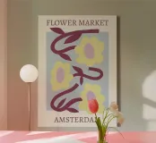 Tauchen Sie mit diesem einzigartigen Digitalposter in den heiteren Charme der Blumenmärkte von Amsterdam ein. Das Design zeigt drei stilisierte, zartgelbe Blüten mit dezentem Flieder in der Mitte, die durch skurrile, ineinander verschlungene rötlich-violette Stängel und Blätter verbunden sind. Diese abstrakten Formen stehen vor einem beruhigenden, gedämpften blauen Hintergrund und bilden eine harmonische und künstlerische Komposition. Der prominente Text "FLOWER MARKET" oben und "AMSTERDAM" unten vervollständigen diese einladende Hommage an die niederländische Hauptstadt. Dieses hochwertige Digitalposter (7000x5000 Pixel, 300 dpi) garantiert scharfe Details und ausgewogene Farben.