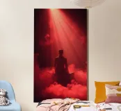 Fesselndes rotes Licht hüllt einen Mann ein, der auf einer Kiste im Nebel sitzt Leinwand
