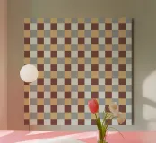 Ein Muster aus abwechselnden farbigen Quadraten erzeugt einen Schachbretteffekt mit Schattierungen von Beige, Grau und Braun. Das gitterartige Muster ist symmetrisch und gleichmäßig verteilt.