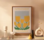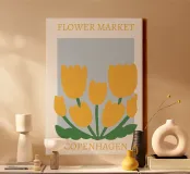 Holen Sie sich den charmanten Geist des Kopenhagener "Blumenmarktes" mit diesem reizvollen Kunstdruck in Ihr Zuhause. Mit einer Gruppe stilisierter gelber Tulpen mit grünen Blättern vor einem sanften blauen Hintergrund verkörpert dieses Poster eine frische und moderne botanische Ästhetik. Die fröhliche Farbpalette und das minimalistische Design schaffen eine erbauliche und einladende Atmosphäre. Dieses hochwertige Digitalposter wurde mit einer Auflösung von 7000x5000 Pixeln und 300 dpi erstellt, um eine außergewöhnliche Klarheit und lebendige Details zu gewährleisten, die ein Erlebnis in Galeriequalität garantieren. Verbessern Sie Ihre Einrichtung mit diesem exquisiten und hochwertigen Poster.