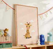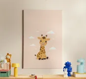 Niedliche glückliche Cartoon-Giraffe mit Wolken sitzend Leinwand