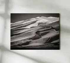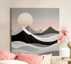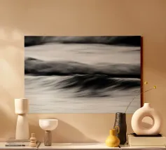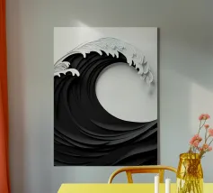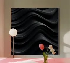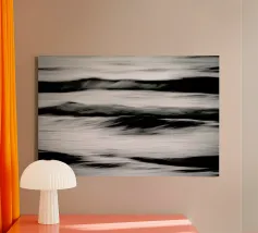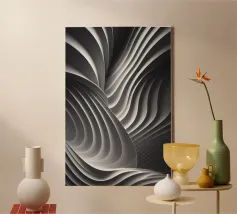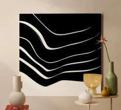 Gebogene schwarze und weiße Wellen wellen sich über die Leinwand und bilden eine abstrakte Landschaft. Die fließenden Übergänge schaffen ein Gefühl von Rhythmus und Tiefe und laden zu Kontemplation und Kreativität ein.