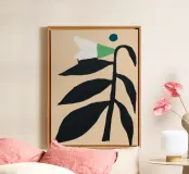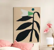 Ein Gemälde mit einer schwarzen abstrakten Pflanze vor einem beigen Hintergrund mit einem grünen Kreis.
