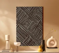 Ein komplexes Zusammenspiel geometrischer Linien erzeugt ein Gefühl von Bewegung und Tiefe, wobei ein monochromes Farbschema die verschiedenen Winkel und Überschneidungen des Designs hervorhebt. Die Gesamtwirkung erinnert an abstrakte oder moderne Kunst und lädt den Betrachter ein, die Wege und Perspektiven zu interpretieren.