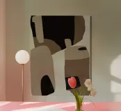 Abstrakte Formen in verschiedenen Braun- und Schwarztönen überlagern sich auf einem cremefarbenen Hintergrund, wodurch eine moderne und minimalistische Komposition entsteht. Die Formen scheinen flach zu sein und haben weiche Kanten, was eine gewisse Fließfähigkeit und Kontinuität im gesamten Werk suggeriert.