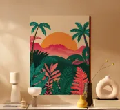 Eine stilisierte Landschaft eines tropischen Dschungels mit Palmen und dichtem Blattwerk, das sich gegen eine große untergehende Sonne und einen rosa Himmel abhebt.